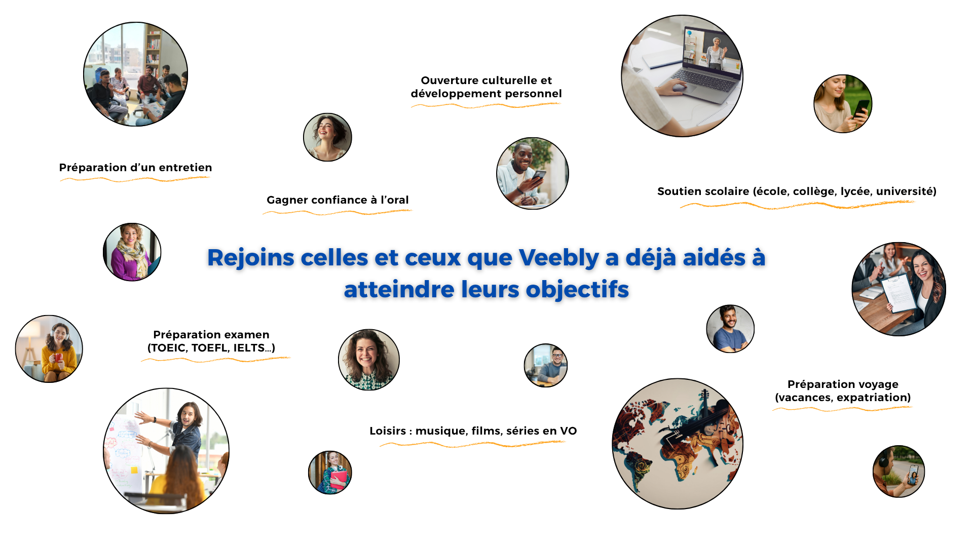 Parce que tu apprends en direct, en tête-à-tête, avec le même professeur natif, sur des cours préparés pour toi — avec une flexibilité totale (Veebly s’adapte à ton emploi du temps : où tu veux, quand tu veux, de 8 h à 21 h, 7 j/7, sur tous les appareils), un suivi personnalisé (même professeur, objectifs définis ensemble, exercices optionnels pour booster tes progrès) et une pratique de l’oral dès la première séance.